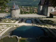 Implanté au flanc du massif de la Chartreuse et face à la chaîne de montagnes de Belledonne, le parc revêt son aspect actuel au milieu du XVIIIème siècle. L'eau est partout présente en cascades et en bassins, son bruissement permanent accompagne le visiteur. Un remarquable escalier d'eau à l'italienne est l'élément majeur de ces jardins. Des terrasses à la française encadrées de charmille offrent des parterres de broderie de buis sur fond de gazon et passe-pieds en graviers colorés. Cet ensemble en font un des plus beaux jardins privés du XVIIIème siècle et l'unique exemple en Rhône-Alpes. Ce château familial évoque les souvenirs de Nicolas-Charles Oudinot, maréchal d'Empire, duc de Regio, et de Victor Oudinot, général et libérateur de Rome en 1849. Il appartient depuis plus de cinq siècles à la même famille qui continue à y habiter.