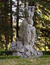 Sculpture (la Faune) de Paul Dardé Représentant un homme chèvre de l'Antiquité. Plus visible de nos jours dans le parc, déplacée au Musée Fleury de Lodève dans l'Hérault 34700. (Paul Dardé "1888 - 1963" est un sculpteur et illustrateur français, natif d'Olmet, aux environs de Lodève, il reçut le Prix National des Arts en 1920).
