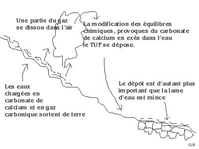 Le TUF se dépose sur les mousses et les morceaux de bois sous la forme d'une croûte, la disparition de ces débris végétaux par fermentation donne en partie, à la roche sa texture poreuse rappelant celle de l'éponge.